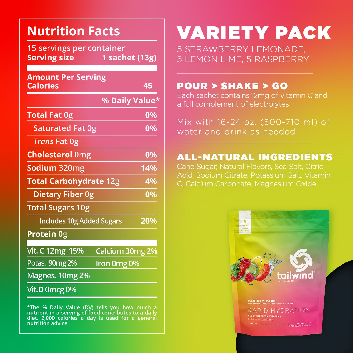 Get all of your favorite flavors in one bag. The Variety Pack contains 5 single servings of each our most popular flavors of Rapid Hydration (Strawberry Lemonade, Lemon Lime, and Raspberry) so you don't have to choose just one.