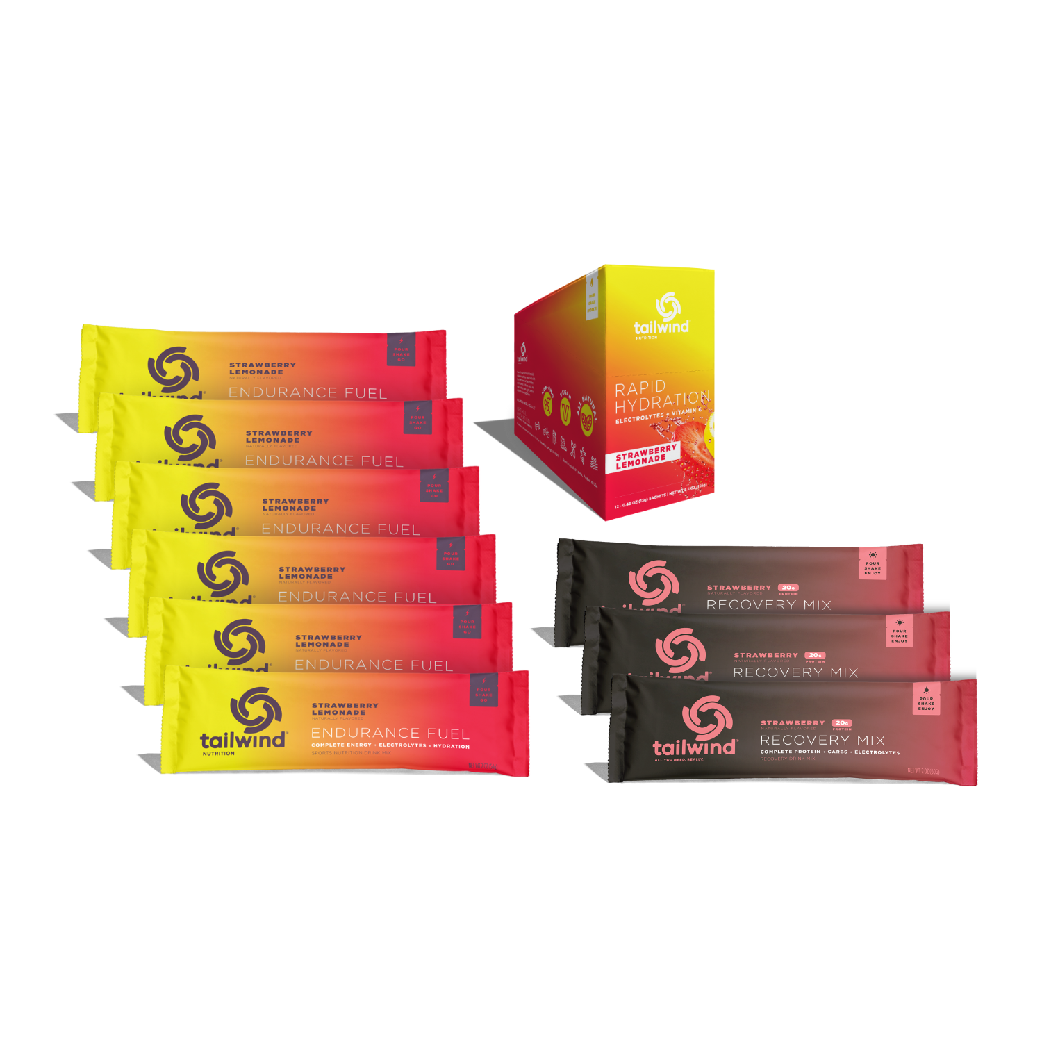 Dial in your performance with endurance, hydration, and recovery in one convenient bundle. Featuring a 6-pack of our Limited Edition Strawberry Lemonade Endurance Fuel, 3 single serving packs of our Strawberry Recovery Mix, and a 12-pack box of our Strawberry Lemonade Rapid Hydration, it’s built for training days, race weekends, and everything in between.