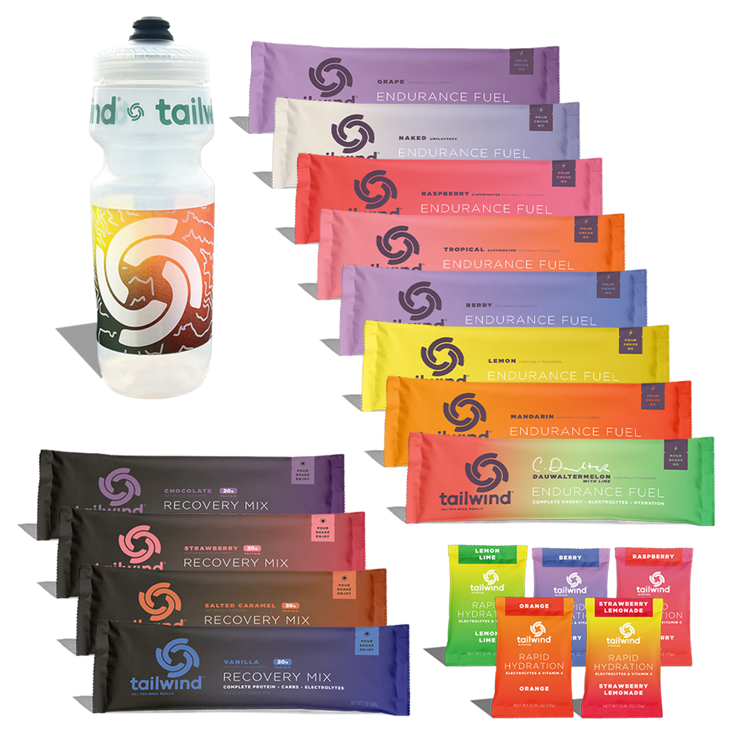 Our Welcome Starter Pack is the perfect way to sample all of our Endurance Fuel, Rapid Hydration, and Recovery Mix flavors, plus a Tailwind bottle. The single-serving stick packs and sachets are perfect for fueling, hydrating, and recovering wherever your adventure takes you!